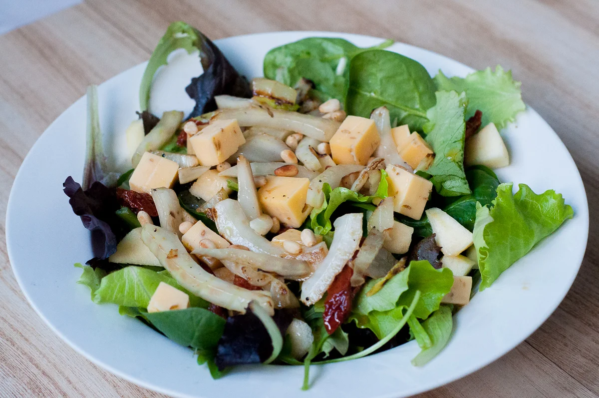 Verdeel de sla over twee borden en maak het bord met de gegrilde venkel, de pijnboompitjes, blokjes komijnekaas, zongedroogde tomaatjes en de dressing.