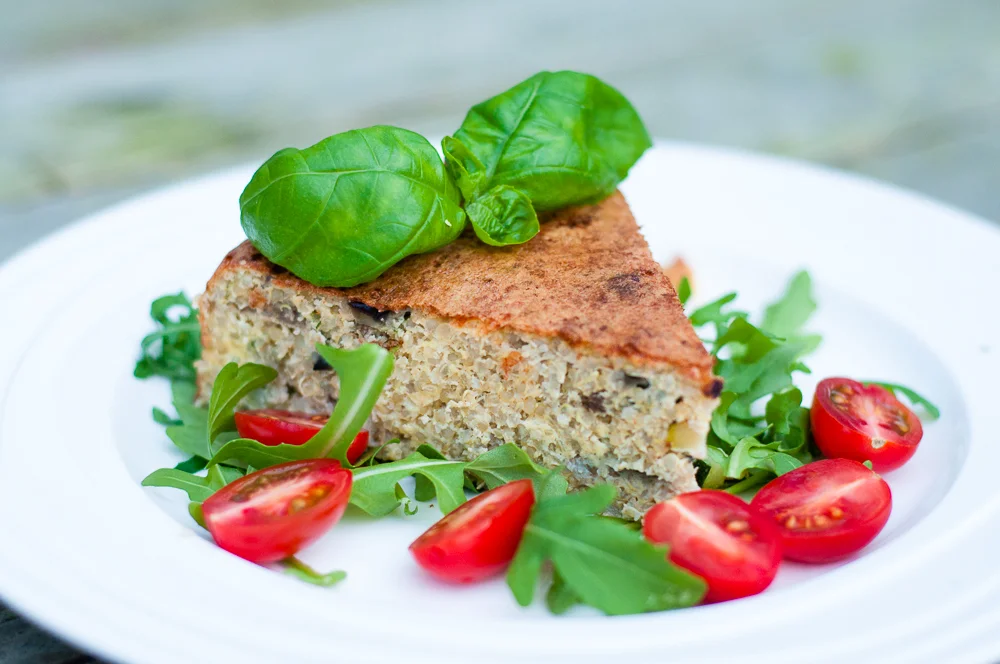 Snijd de ‘frittata’ in 4 stukken als een soort taart.