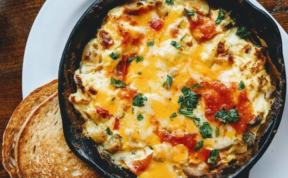 Zet de pan weer op het vuur. Voeg meteen de eieren toe aan de groenten en laat vijf minuten bakken.