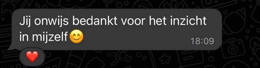 “Het is boven verwachting informatief geweest. Wist dat ik veel zou leren en herkennen, maar dat *alles* exact klopte verraste me. De sessie heeft mij veel rust opgeleverd: hey, ik zit goed, ben op het juiste pad. Bevestiging dat mijn grootste uitdaging mijn grootste kracht is, en dat dat patroon doorbreken mijn sleutel is.