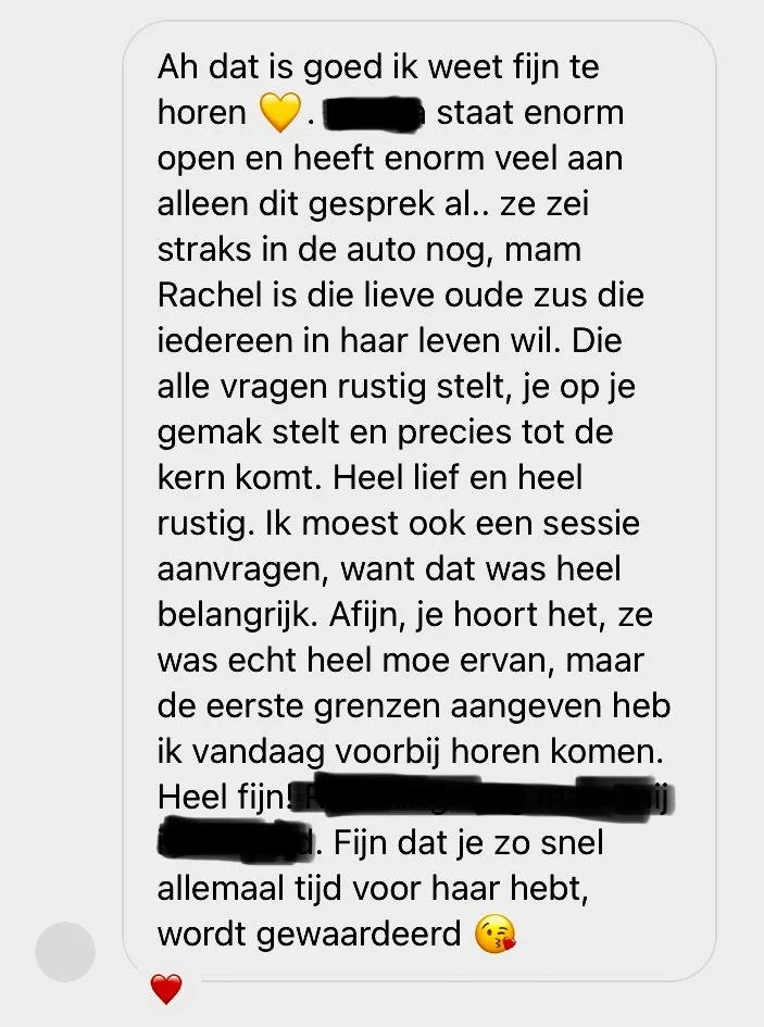 "Ik had niet echt een verwachting van te voren, vond het achteraf wel fijn dat we 1,5 uur lang een gesprek hadden. dit stelt je wat op je gemak en door dingen uit te spreken ga je zelf al een patroon ontdekken. De 2e sessie: - bijzondere regressie met meer duidelijkheid in de emoties die er zaten bij de overleden persoon. De sessie heeft me inzicht in patronen opgeleverd die ik zelf eigenlijk al wel wist maar niet op een rijtje had. Ik vond het prettig dat je zo lief sprak met de overleden persoon, je deed dit op een zeer respect-, en liefdevolle manier. echt heel mooi! Ik zal zeker mensen aanraden om naar jou toe te gaan! Dank je wel lieve Rachel! 😘”