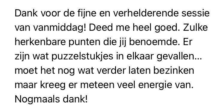 Deze sessie heeft me dan wel weer een stukje bewust gemaakt van dat er iets is waar ik aan kan werken om het patroon te doorbreken. Ik vind je een heel rustig en relaxt persoon en je hebt een energieke vibe, ik voel me wel op mijn gemak als ik bij je ben op welke locatie dat dan ook is. Ik ben wel weer een ervaring en kennis rijker en daar ben ik je dankbaar voor!"